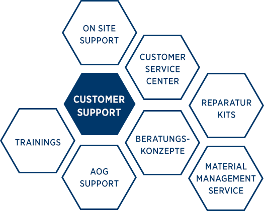In addition to the individualized consultation concepts, our service includes a Customer Service Center which is available to our customers as a key personal contact for every task surrounding sales and service. At customer request, we also offer special AOG concepts that are customized to your requirements so as to enable the continuous availability of critical spare parts or to support you directly on location on the basis of on-site support.